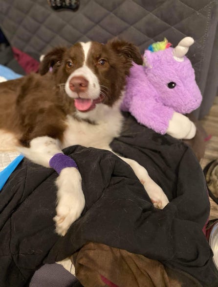 Kenna is back home with her foster family. Kenna was surrendered with her favorite unicorn and Madi (foster sister) thought it would be best to bring out her very own unicorn and hang out with her. For now, we wait. Test results from her spinal tap will help Dr Cross prescribe the appropriate medication. Her recovery chances are unknown, but if left untreated, she would not have survived. A year long infection brewing in her brain will take a while to reverse course. As always, prayers, good wishes, good juju is always appreciated.