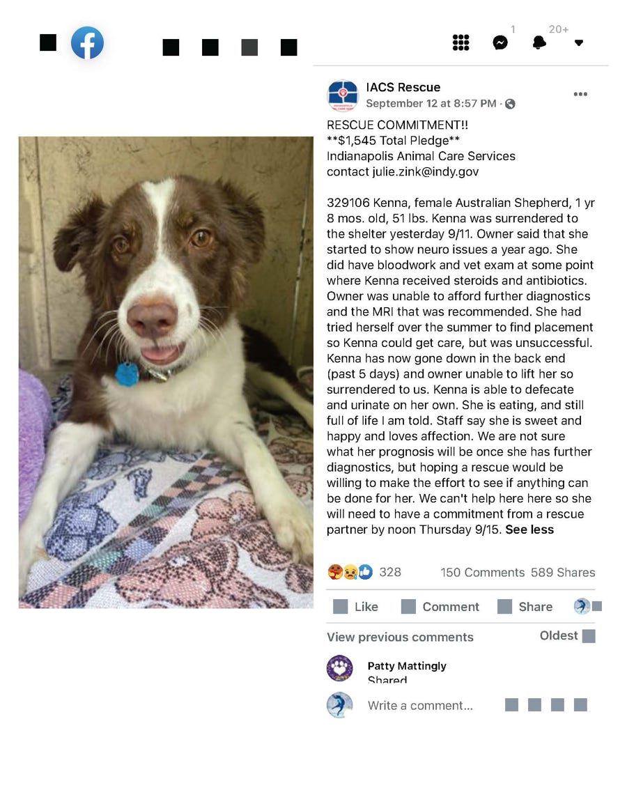 Thank you for all who have donated to Kenna. It is with a heavy heart that I need to tell you that she passed away this morning. Prayers to Cait and her family for loving her. Thank you again for donating - we were able to raise nearly 63% of her bill which leaves funds for the next dog.